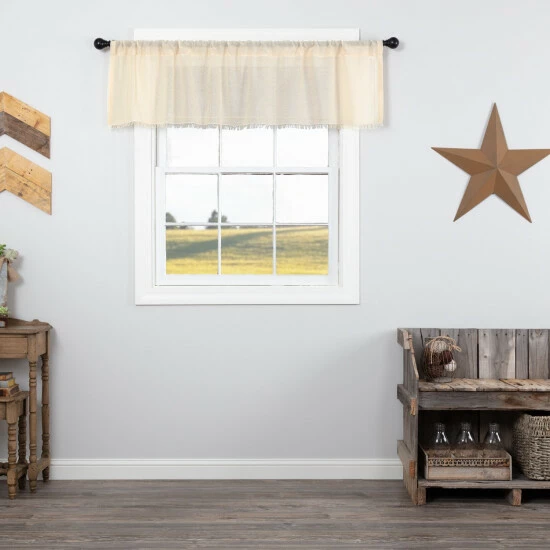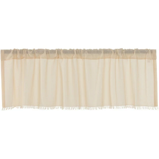 The Tobacco Cloth Natural Valance Fringed 16×60 MATERIAL & CONSTRUCTION: The Tobacco Cloth Fringed valance uses our loosely woven cotton fabric for a versatile, rustic finish that gives texture to your kitchen with a touch of sheer elegance.,
