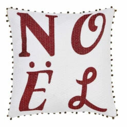 - “NOEL” embroidered in shimmery candy apple red thread, each letter in a different font