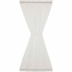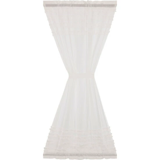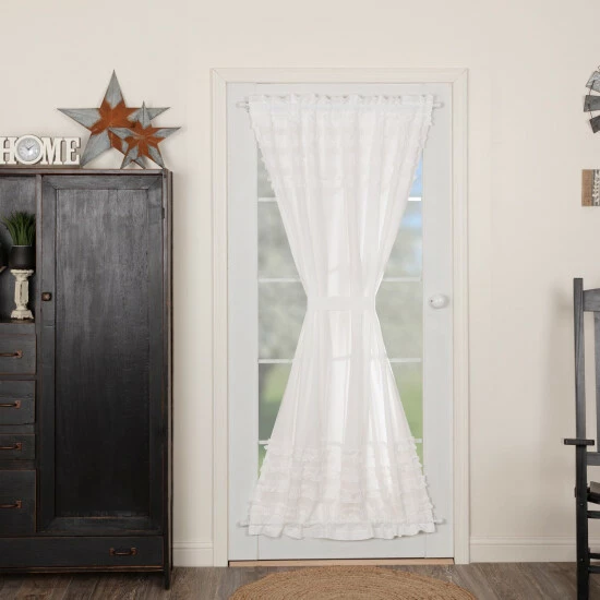 The White Ruffled Sheer Petticoat Door Panel combines light and airy, sheer fabric with multi-tiered frills to create a perfect balance of sophistication and playfulness. This flirty all-cotton curtain dresses any room with a refined, delicate sense. Their double-sided ruffles mimic those found on old-fashioned petticoats, giving them a hint of country glamour. This 72×40 farmhouse door panel includes a tie back and two rod pockets.