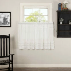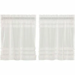 The White Ruffled Sheer Petticoat Tier Set of 2 presents sheer elegance and exquisite design. Featuring white sheer cambric with ruched ruffle design, creating a simple, graceful look for your farmhouse style home. Curtains include rod pocket for easy hanging. 100% cotton.