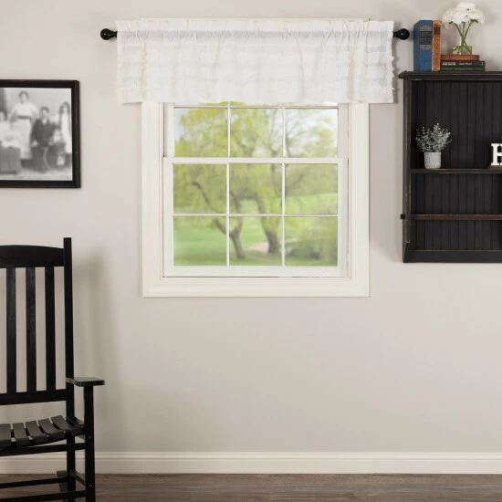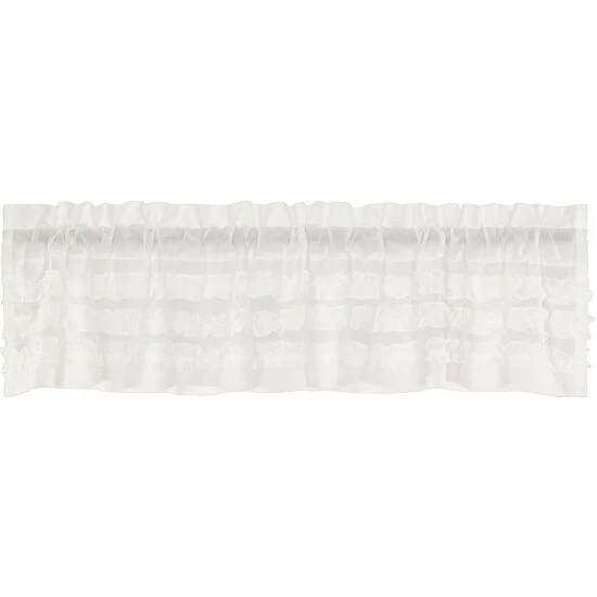 The White Ruffled Sheer Petticoat Valance 16×72 presents sheer elegance and exquisite design that will brighten up any room. Featuring white sheer cambric with ruched ruffle that adds a simple, graceful look for your farmhouse style home. Curtains include rod pocket for easy hanging. 100% cotton.