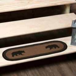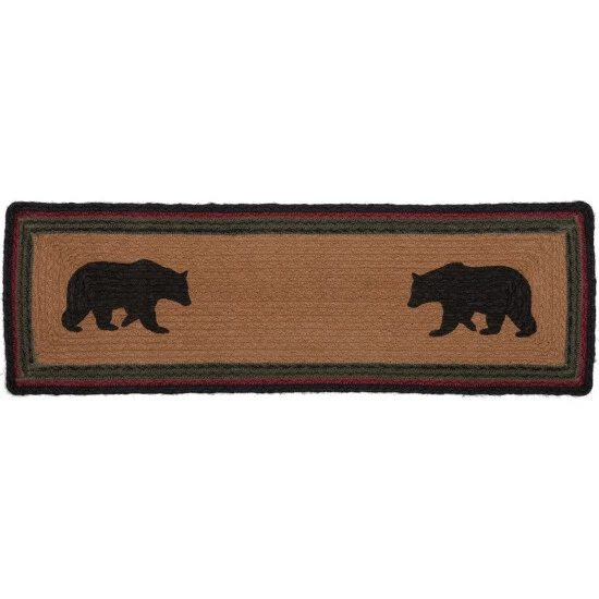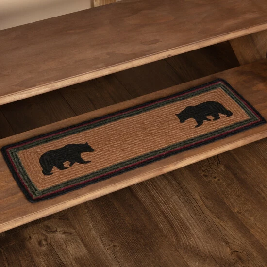 Β Capture the essence of rustic living with the wonderfully unique Wyatt Stenciled Bear Jute Stair Tread. Displaying two black bears facing each other on a dark tan center, our 8.5×27 rectangular stair tread features earthy lodge colors of black, crimson, and army green on soft and durable concentric jute braids. The rugged color and rustic design makes this an ideal addition to a lodge, log cabin, or lake house inspired home. For your safety, there is a latex spray on the reverse side to prevent slippage. 100% jute.Β
